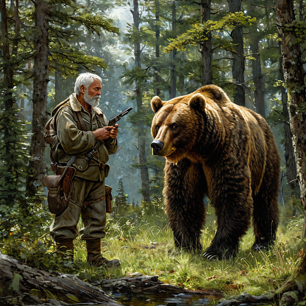 Старый охотник, Григорий, шел по лесу, опираясь на свое посох, изрезанный временем и многими походами. Его лицо, изборожденное морщинами, было словно карта пройденных троп, а глаза, прищуренные от солнца, хранили мудрость многих лет, проведенных в объятиях дикой природы. Он шел не за добычей, а за спокоем, за тем согласием с лесом, которое приходит только к тем, кто понимает его язык. Внезапно, воздух сгустился, застыл в ожидании. Григорий услышал этот звук – глухой топ тяжелых лап, пробивающий тишину леса. Медведь. Не молодой, нахальный медвежонок, а старый, опытный самец, чья сила чувствовалась даже на расстоянии. Григорий не испугался. Он знал медведей. Знает их привычки, их характер, их силу. Он знал, что ненужная встреча может стать последней. Он медленно опустил руку к ружью, но не торопился. Он наблюдал. Медведь вышел на прогалину. Его массивная фигура заслонила солнце. Он был величественен, могуч, и в то же время спокоен. Он не смотрел на Григория с агрессией, а рассматривал ег