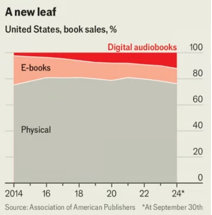 Действия Amazon обещают подстегнуть бум аудиокниг. По данным торгового совета Ассоциации американских издателей, продажи в этом году на 27% выше, чем за тот же период 2023 года, чему способствовал выход Spotify на рынок. Аудиокниги, которые когда-то были чем-то вроде сноски в издательском мире, теперь составляют 12% потребительского книжного рынка Америки, что больше, чем доля электронных книг (см. диаграмму).
