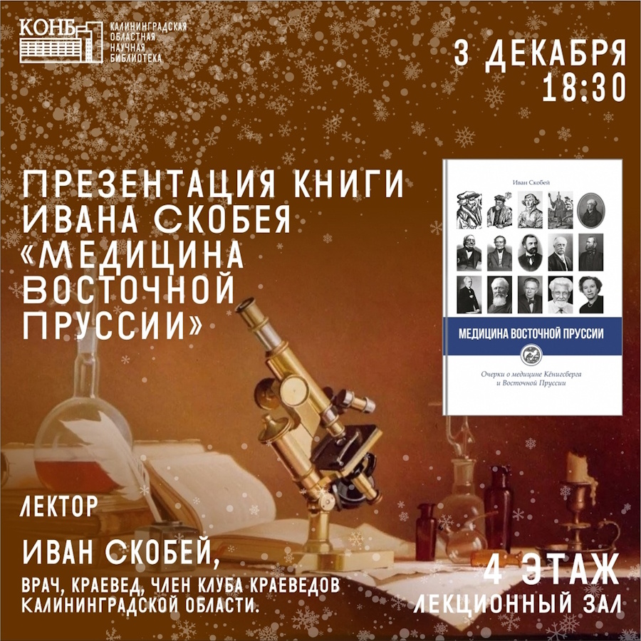 Во вторник, 3 декабря, в Калининградской областной научной библиотеке известный в области краевед и врач-терапевт Иван Скобей представил свою книгу «Медицина в Восточной Пруссии» (16+). Она раскрывает неизвестные страницы старейшего университета Альбертина и городских медучреждений, существовавших до Второй мировой войны.