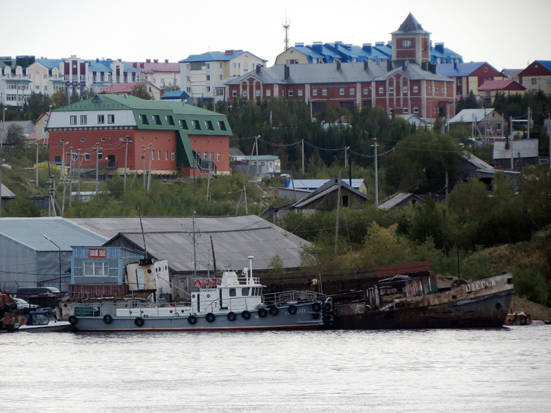 На высоком берегу Оби стоит Аксарка, крупное село (2,6 тыс. жителей), обладающее такой роскошью, как асфальтовая дорога до Салехарда. По дороге сюда ехать меньше часа, а по реке мы спускались часа три. Живут здесь в основном русские, коренных народов меньше тысячи человек, и ненцев уже почти столько же, сколько хантов. Для последних Аксарка - этакий северный форпост. У пристани - большой дебаркадер. Хотя "Калашников" здесь не останавливался, посёлки ниже по реке обслуживают другие суда: Аксарка - кажется, самый ухоженный посёлок на Оби: В Аксарке хороший музей, его директор ещё до поездки предлагал съездить в гости к его знакомым ненцам, но ненцы, после короткого разговора по мобильному, прислали смс "Семейный совет не дал добро, принять вас отказываемся" - как мне объяснили позже, у них что-то стряслось, но упущенное там мы наверстали под Антипаютой. Вниз по течению провожает храм Богоматери Одигитрии, что значит - Путеводительницы. Как благословение перед началом земли без дорог: