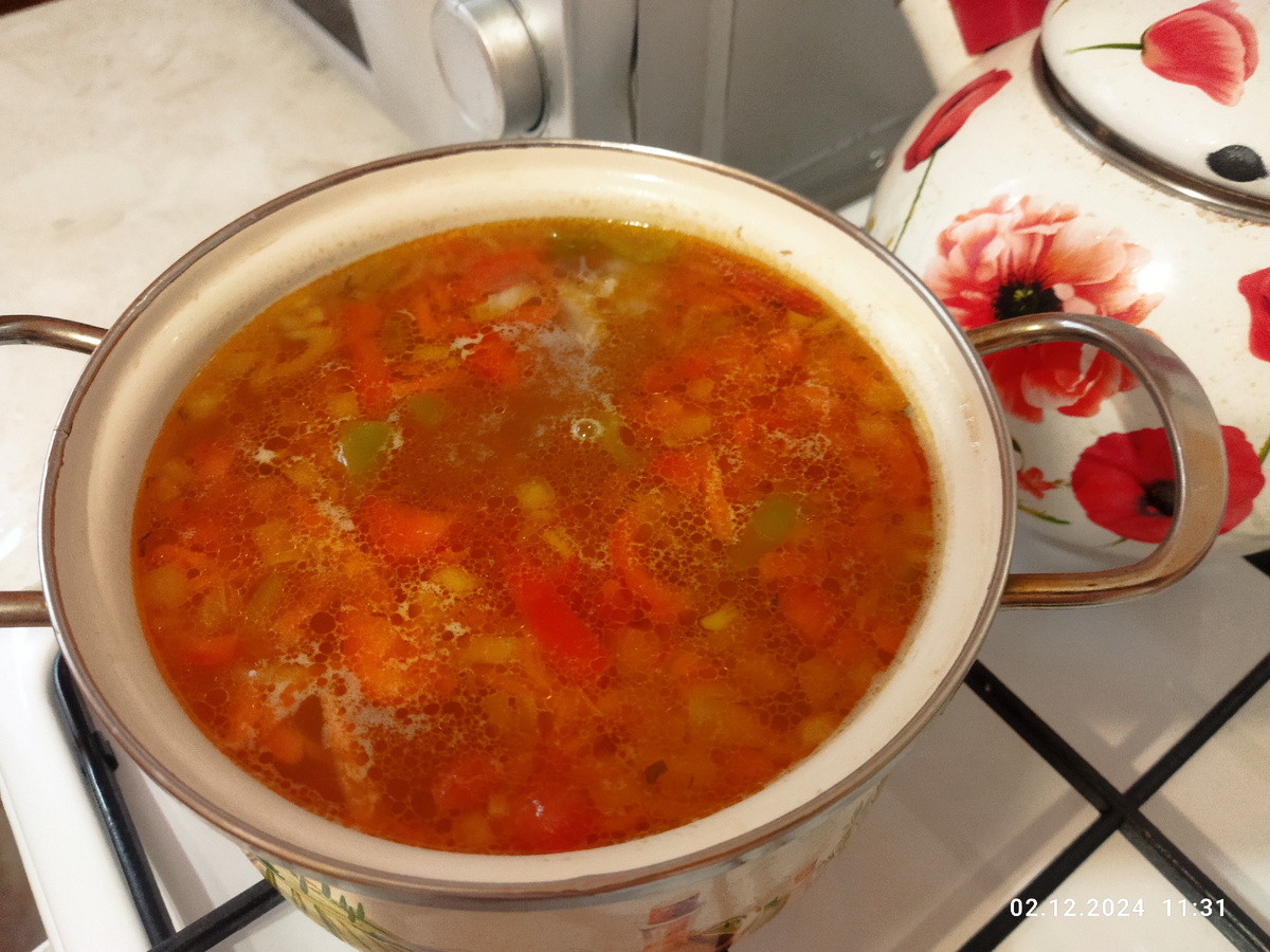 Этот рецепт не претендует на Оскар или гуру кулинарии. Но если вдруг решите его повторить, то дома у вас 100 процентов будет шикарный и наваристый суп 🍲 Он совсем прост, самое главное на мой взгляд для вкуснейшего супа, это насыщенный и наваристый мясной бульон, который и будет главной основой. Итак подготовим мясную говяжью лопатку или уголок, варим 1,5 часа. Совет: Первую воду рекомендую слить и промыть мясо, после того как закипит. Убиваем двух зайцев, избавимся от всяких наполнителей да и ещё от накипи, которую не придётся потом снимать. Ждем - с, пока варится. Дальше только все начинается в виде картошки, лука и т. д. Делаем зажарку, обжариваем на сковороде с маслом очищенные порезанные и натертые лук и морковку, далее добавляем мою чудесную заготовку, которую делаю осенью, после сбора урожая. Это универсальная штучка, выручает всю зиму. Чистим картошку. Приготовим рис, давим чеснок. Всё в кастрюлю. Теперь в граммах: Говяжья косточка с мясом - 400 - 500 грамм. Лук репка - 1 ш