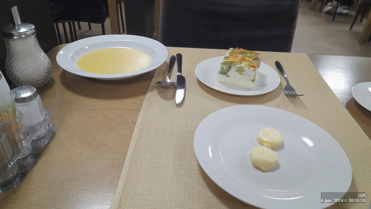 Завтрак был сегодня очень даже и. У дедушки соседа большой омлет с брокколи и каша кукурузная.