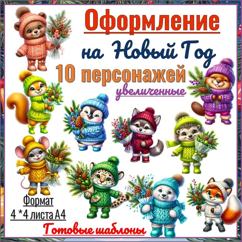 Новогоднее оформление "Зверята". Готовые шаблоны, увеличенные иллюстрации. 10 персонажей.