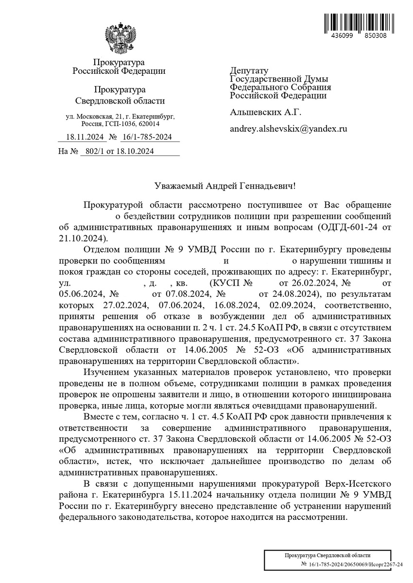 Участник спецоперации пытается добиться порядка и соблюдения законов. Ему и его близким не повезло с соседями по новостройке, которые чуть ли не ежедневно бушуют, не зная границ. Обращался многократно в ОП № 9 – толку никакого. Устал от безразличия правоохранителей. Нельзя оставлять нашего защитника в беде. Передал свои запросы в региональные прокуратуру и ГУВД. Кто непосредственно поможет, если не они?! Отзывчивость сотрудников надзорного ведомства заслуживает самых добрых слов. Они подняли все материалы, проверили работу «дежурки» и пришли к неутешительному выводу: полицейские бездействовали (не опрашивали заявителя, свидетелей, лениво выезжали на место). Совершенно иная реакция последовала от областного главка. Тот занял сторону своих нерадивых подчиненных, не усмотрев за ними никаких нарушений. Выглядит как круговая порука. И это повод для новой проверки.