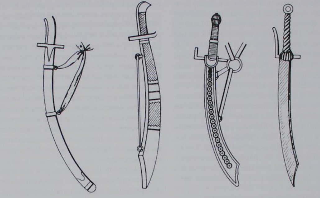 Как вы понимаете, они весьма схематичны и сильно стилизованы, к тому же показывают сабли в ножнах (кроме крайней справа), из-за чего судить о геометрии клинка нельзя вообще. К тому же, весьма вероятно, это оружие вообще следует называть не саблями, а мессерами или дюссаками - уж очень явственно родство прослеживается...