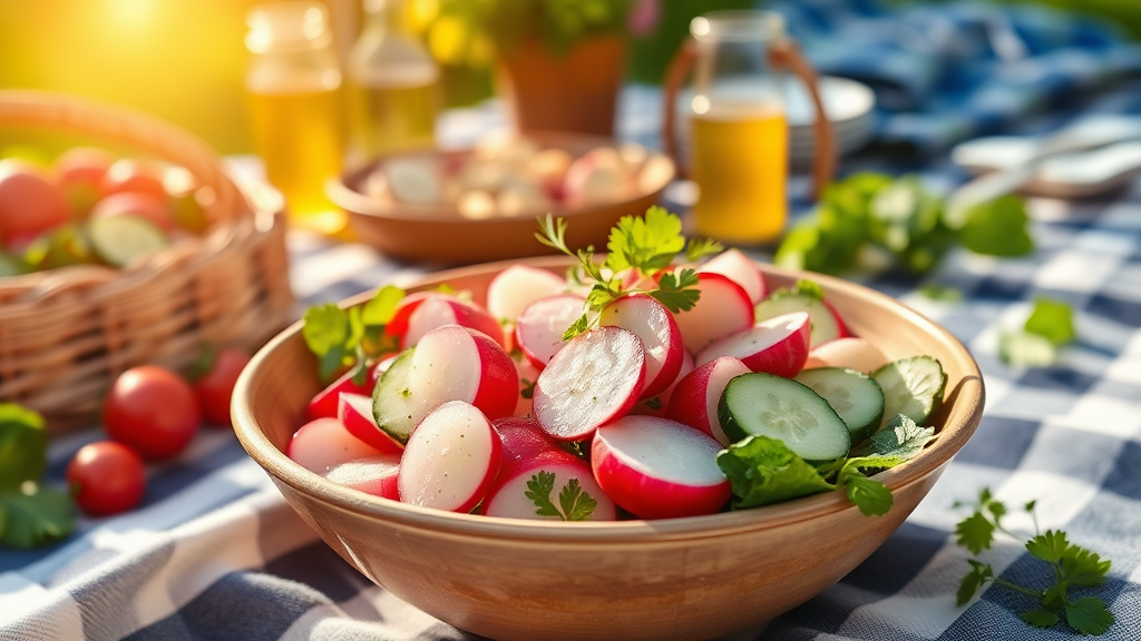 На летнем пикнике, где солнышко дарит свои золотые лучи, а аромат свежих овощей наполняет воздух, идеальным дополнением станет эта закуска из редиса и огурцов. Вместе с родными и друзьями собираемся за столом, наслаждаемся каждым кусочком и обсуждаем все, что происходит в жизни. Эта простая, но невероятно освежающая закуска будет совершенно незаменима в такие моменты.