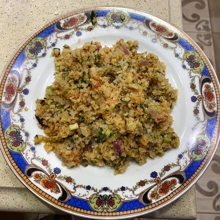 Небольшой кочан цветной капусты (500-600 г) разбираем на соцветия и пропускаем через мясорубку с крупной решёткой. Получаем массу, похожую на рис. Обжариваем на сухой (!) сковороде. Не солим, иначе капуста даст сок, и будет вариться. Капуста должна стать золотистой и мягкой. Параллельно занимаемся «наполнителям»и к капусте. Обжариваем в масле лук (у меня красный), и дальше - что подскажет ваша фантазия - перец, морковь, только немного. Режем зелень - петрушка, укроп, зелёный лук. Когда капуста готова, смешиваем все в одной сковороде. Можно добавить томатную пасту (у меня - домашняя лютеница). Прогреваем, солим, перчим, заливаем лимонным соком (30-50 мл). Выключаем огонь. Оставляем под крышкой пропитываться запахами и ароматами. Отличный гарнир к мясу, основа для салата и т.д. Можно изобразить что-то в виде плова. Этот рецепт хорош ещё для детей-диабетиков, которые не любят капусту. Вкус капусты не чувствуется. КБЖУ на 100 г - 74/2,1/5,2/5,1. + 4 фото Рецепт на странице Автор рецепта –