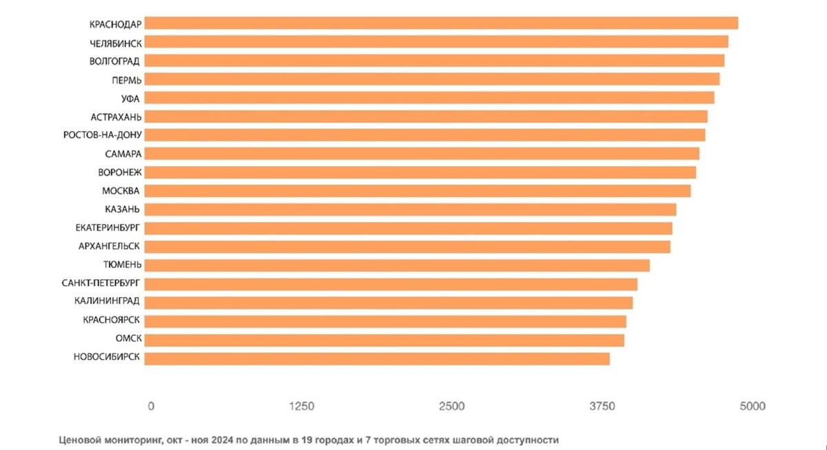 В результате подсчитали, что в среднем по стране покупка самого необходимого продовольствия обойдется в 4302 рубля в месяц. При этом в Волгограде такая же корзина стоит 4757 рублей. Дороже продовольственные корзины оказались в Краснодаре (средняя стоимость – 4865 рублей) и Челябинске (4786 рублей). Выгоднее всего покупать продукты могут новосибирцы (3802 рубля), омичи (3922 рубля) и красноярцы (392