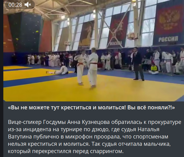 Все началось с того, что один из юных дзюдоистов, волнуясь перед поединком, традиционно решил перекреститься. Мол, в минуты напряжения мы все ищем поддержки, и для многих людей крестное знамение — это просто ритуал перед выходом на бой. Но Наталья Ватутина, стоя на своем посту судьи, решила, что это слишком… слишком религиозно для спортзала.