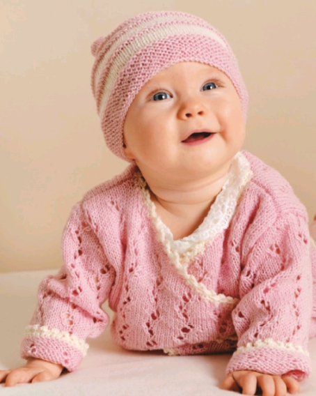 Костюм для малышки состоит из ажурного жакета, широких, удобных штанишек и шапочки с ушками.