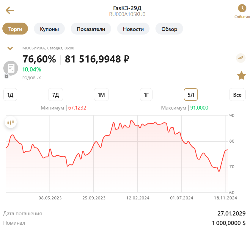 Замещающая облигация ГазКЗ-29Д: график рублевой цены до ноября 2024 года