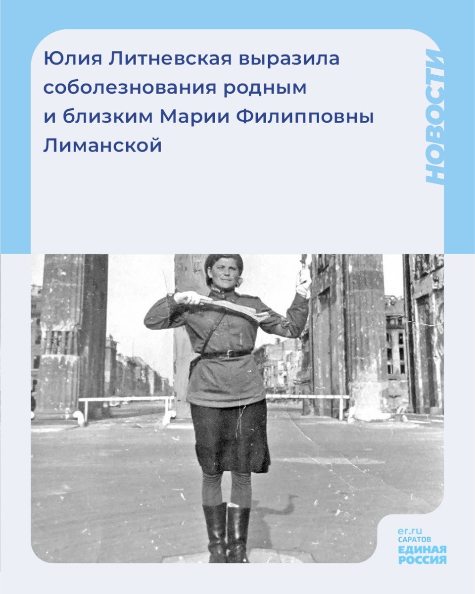 🕯️Закончила свой земной путь знаменитая Бранденбургская мадонна Мария Филипповна Лиманская. Замечательная, светлая, мудрая и добрая женщина жила в селе Звонарёвка Марксовского района Саратовской области. 🇷🇺Региональный координатор проекта «Историческая память» партии «Единая Россия», председатель комитета Саратовской областной Думы по образованию и культуре, председатель Саратовского регионального отделения Союза женщин России Юлия Литневская выразила глубочайшие соболезнования ее дочери Нине Григорьевне, многие годы заботливо ухаживавшей за своей героической матерью, в буквальном смысле продлевавшей ее век. В этом году отмечалось столетие Марии Филипповны. Совсем немного знаменитая регулировщица не дожила до юбилея великой Победы - святого для неё и всей страны праздника. Она запечатлена у Бранденбургских ворот на знаменитом снимке Евгения Халдея - главного фотографа Великой Отечественной войны. Еще при жизни Марии Филипповне в Марксе был установлен памятник. Правда, она сама у