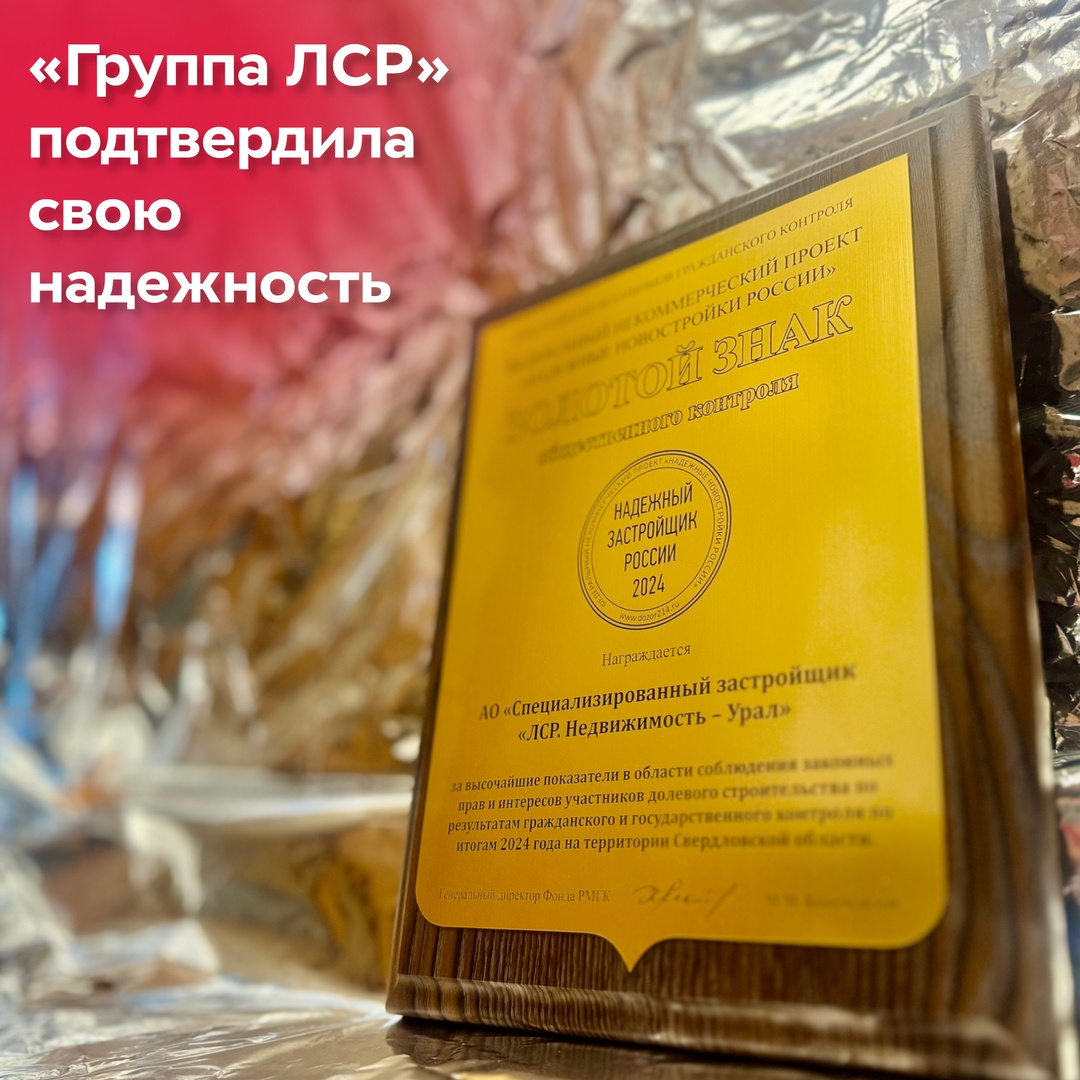 Наша компания вновь получила главную общественную награду в сфере строительства — «Надежный застройщик России 2024». Мы гордимся, что наша компания: Отметим, что золотой знак вручается за весомые достижения в области соблюдения законных прав и интересов участников долевого строительства. Эксперты проверяют юридическую и фактическую информацию о возводимых проектах и под видом «тайных покупателей» обращаются в отделы продаж для подтверждения, что работа застройщика соответствует законодательству. Среди всех строительных компаний Свердловской области «Группа ЛСР» — единственный девятикратный обладатель этой престижной премии.