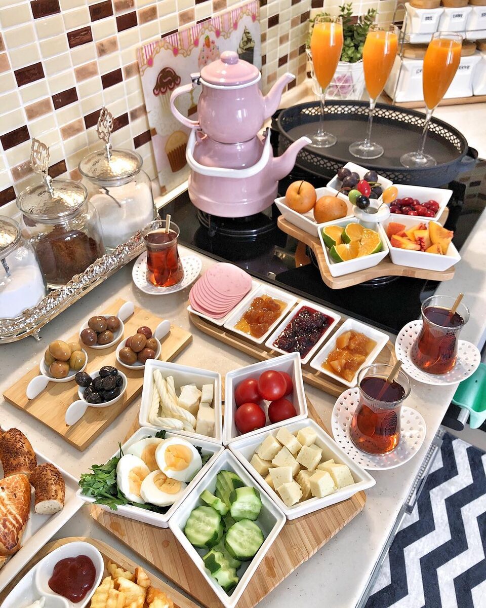 - Особенности: на закуску салаты, овощи, жареная картошка-фри, оливки, вареные яйца. Различные десерты: рахат-лукум, пахлава, клубничное, персиковое, апельсиновые варенье, орехи — в еще более маленьких тарелочках подаются к чаю, после основного приема пищи.