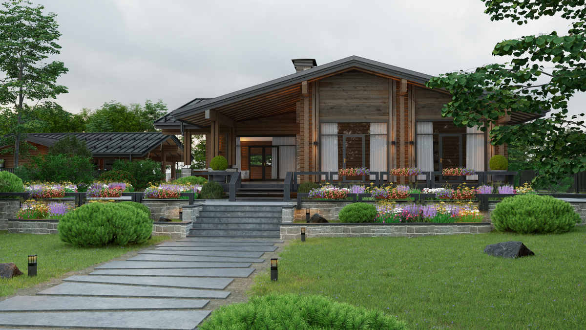 Этот проект дома действительно отражает стремление к гармонии с природой и комфорту загородной жизни. Внутреннее пространство продумано так, чтобы максимально использовать природное освещение и естественные материалы, создавая атмосферу уюта и тепла. Открытая планировка позволяет легко перемещаться между разными зонами: кухней, столовой и гостиной, что идеально подходит для проведения времени с семьей и друзьями. Большие окна наполняют комнаты светом и позволяют любоваться окружающими пейзажами, будь то зеленые леса или живописные поля. Использование камня или Арт-Бетона в сочетании с деревом не только подчеркивает элегантность дизайна, но и обеспечивает долговечность и устойчивость конструкции. Это особенно важно в условиях переменчивого климата, когда дом должен быть надежным убежищем для своих обитателей. Предусмотренные элементы ландшафтного дизайна, такие как терраса и сад, дополняют общую концепцию загородного отдыха. Открытое пространство на свежем воздухе позволяет заниматься р