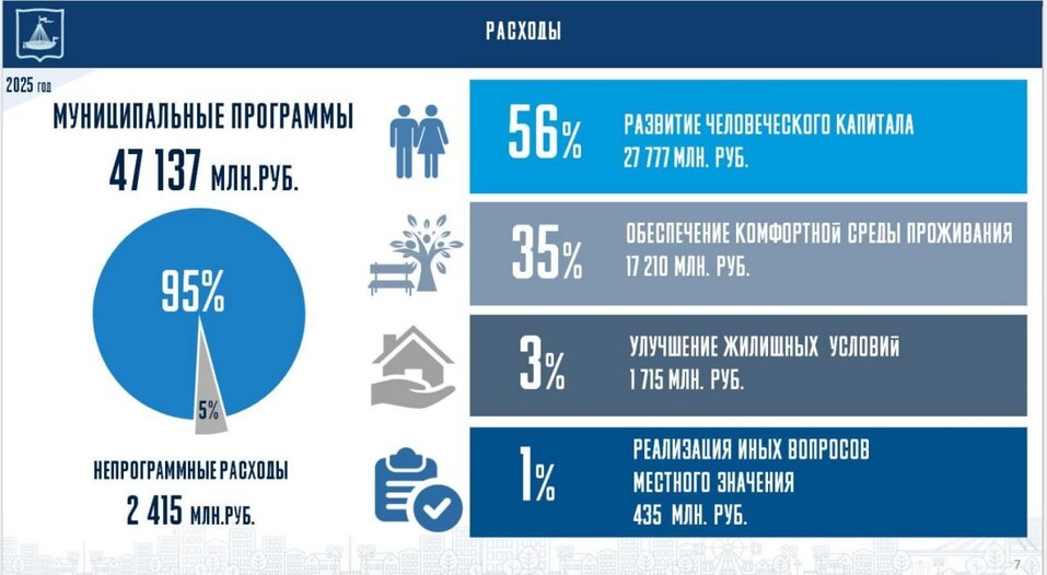 Депутаты городской думы Тюмени одобрили проект бюджета на 2025 г. Он предполагает дефицит почти в 3 млрд руб. Доходы Тюмени в следующем году составят 46,6 млрд руб., а расходы — чуть больше 49,5 млрд. Гасить дефицит планируется за счет остатка средств и кредита. В проекте бюджета было указано, что источниками финансирования дефицита бюджета на 2025 г. являются ожидаемые на 01.01.2025 остатки средств в сумме 2 151 339 тыс. руб. и поступления от привлечения кредитов от кредитных организаций в сумме 780 000 тыс. руб. Глава города Максим Афанасьев отметил, что 56% бюджета будет распределены между отраслями образования, культуры, спорта и молодежной политики. Объем вложений в дорожную отрасль составит 3 млрд руб. На организацию транспортного обслуживания запланировано свыше 5 млрд. Из них 828 млн на обновление автобусного парка, 123 млн — на реализацию пересадочного тарифа. Афанасьев добавил, что в следующем году продолжится благоустройство парка в Комарово, запланированы работы по созданию