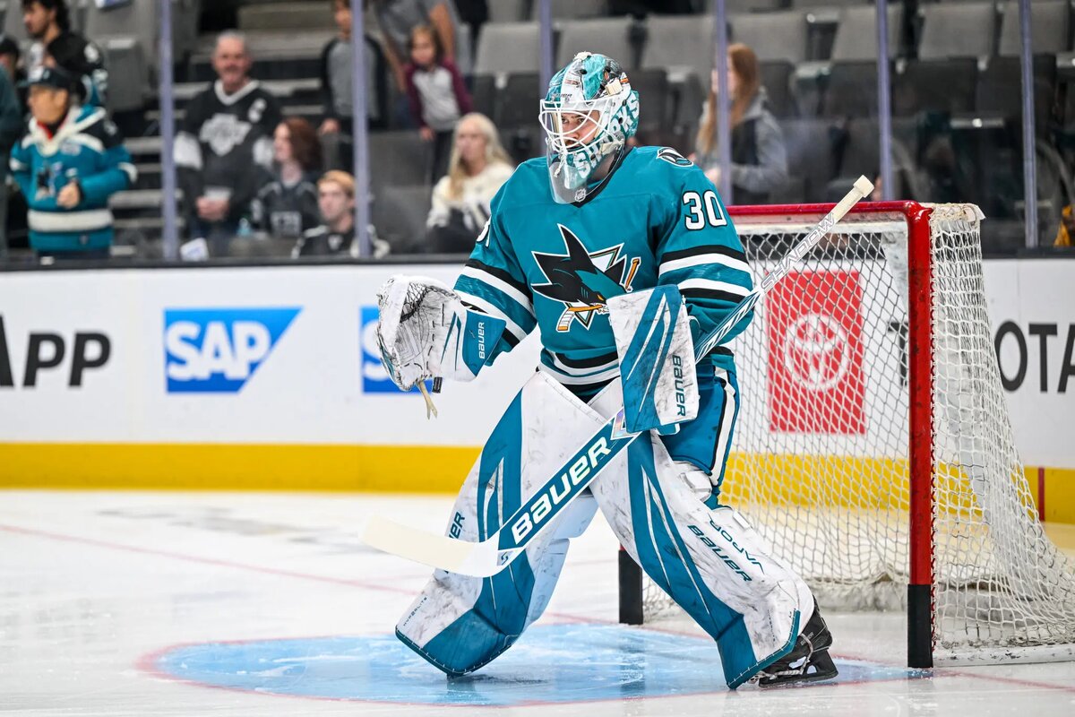 Это была короткая, но красивая история – и я сейчас говорю не о последнем альбоме певицы Сабрины Карпентер. Во вторник «Сан-Хосе Шаркс» отправили обратно в АХЛ своего топового проспекта Ярослава Аскарова, который отыграл 2 матча в Национальной хоккейной лиге. За короткий период, что российский голкипер провел в стане «акул», он успел произвести неизгладимое впечатление, поразив болельщиков классными сэйвами, ошеломляющей работой с шайбой, а также забавнейшими интервью. 22-летний Аскаров одержал одну победу при одном поражении, отразив 92,7% бросков, и подарил фанам «Сан-Хосе» яркое предвкушение будущего, которое может ждать команду с ним в воротах. Посмотреть видео Возвращение россиянина в АХЛ связано с тем, что в составе «Шаркс» есть 2 здоровых опытных голкипера в лице Маккензи Блэквуда и Витека Ванечека. Держать в своем составе трех вратарей «акулы» не собиралась. Впрочем, это лишь дело времени, когда Аскаров получит постоянную прописку в основе «Сан-Хосе». И Блэквуд, и Ванечек являю