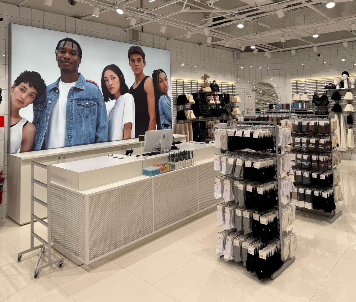 Новый магазин — это большое пространство в стиле минималистичного фьюжн. В магазине представлена мужская и женская коллекция, одежда для дома и спорта, обувь и аксессуары.