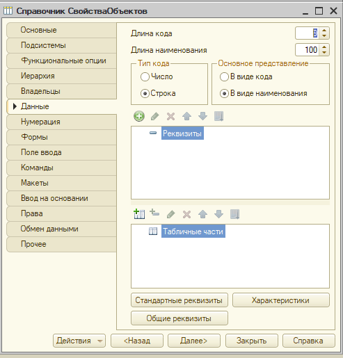 Достаточно редко пользуюсь ПВХ (планами видов характеристик) и каждый раз приходится долго вспоминать, что и зачем нужно делать. На днях опять потребовалось использовать ПВХ и что бы не забыть, решил написать данный текст с последовательностью действий при добавлении в 1С возможности пользователям вводить свои характеристики объектов. Все действия буду производить в каркасной конфигурации для подготовки к экзамену 1С Специалист, так как часть объектов там уже создано. Первым делом нужно создать 2 справочника: Свойства объектов и Характеристики объектов. В первом справочнике будет храниться общее наименование характеристик. У справочника СвойстваОбъектов выставляем в качестве владельца, к примеру, справочник Номенклатура, что бы была возможность привязать свойства к номенклатуре. Так же на вкладке "Данные" надо установить приемлемую длину наименования - я обычно ставлю 100 Далее создается справочник Характеристики, где будут храниться конкретные характеристики. Т.е. если в справочнике