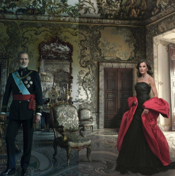 В начале этого года Летиция и Фелипе позировали для знаменитого фотографа Энни Лейбовиц. Поводом для фотосессии стла двойная круглая дата - 20 лет брака и 10 лет вступления на испанский престол. Летиция позировала в эффектном бальном платье от испанского дизайнера, дополненной алой атласной накидкой. Королева Летиция - лучший представитель испанской моды. Поэтому выбор дизайна, который она будет носить на этом портрете, не мог быть простым. Вместе со своим стилистом Евой Фернандес, они остановились на этом уникальном произведении Кристобаля Баленсиага, созданное кутюрье еще в 1948, которое принадлежит частной коллекции, хранящейся в Фонде Антони де Монпало. Это платье высочайшей элегантности, подчеркнутое драпировкой, обтягивающей фигуру королевы и открывающее плечи и руки. Шею украсило бриллиантовое ожерелье королевы Виктории Евгении Баттенбергской, прабабушки нынешнего короля, которое идеально сочетается с крупными серьгами-каплями. Король Фелипе выглядит эффектно в военной форме с с