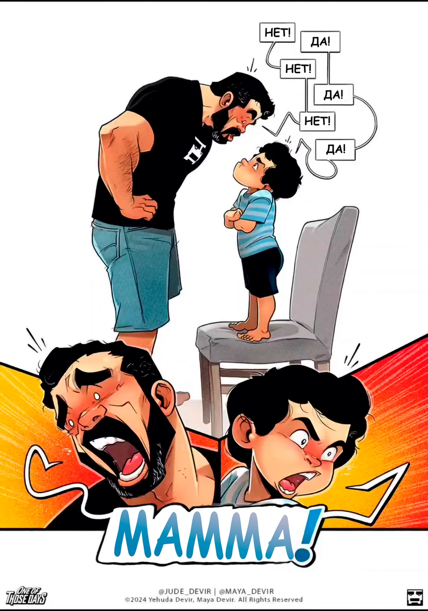 Вот будут дети, тогда поймешь – слышали такое? Говорят, что родительство – это тяжело, это ответственность и постоянная забота. Всё правда. Но почему-то забывают, что нынешние мамы и папы – это тоже дети, только постарше. Комиксы от израильского художника Иегуды Девира станут настоящим открытием и откровением для всех. Художник живописует будни семейства, с отменным юмором показывая себя и свою супругу в ситуациях, когда они сами похожи не на маму-папу, а на расшалившихся ребятишек. Иегуда Девир – автор комиксов, известный всему миру. Число подписчиков его историй под названием «Один из тех дней» перешагнуло за 5,6 млн. И это не предел, ведь в паре с супругой Майей, он еженедельно выкладывают очередной смешной сюжет, чем вызывают восторг почитателей и привлекают новых поклонников. Фанаты с нетерпением ждут очередные веб-комиксы, а если очередность нарушается, начинают забрасывать автора посланиями. Слава – тяжкое бремя, но Девиры не унывают. Они делятся своими наблюдениями и выкладыва