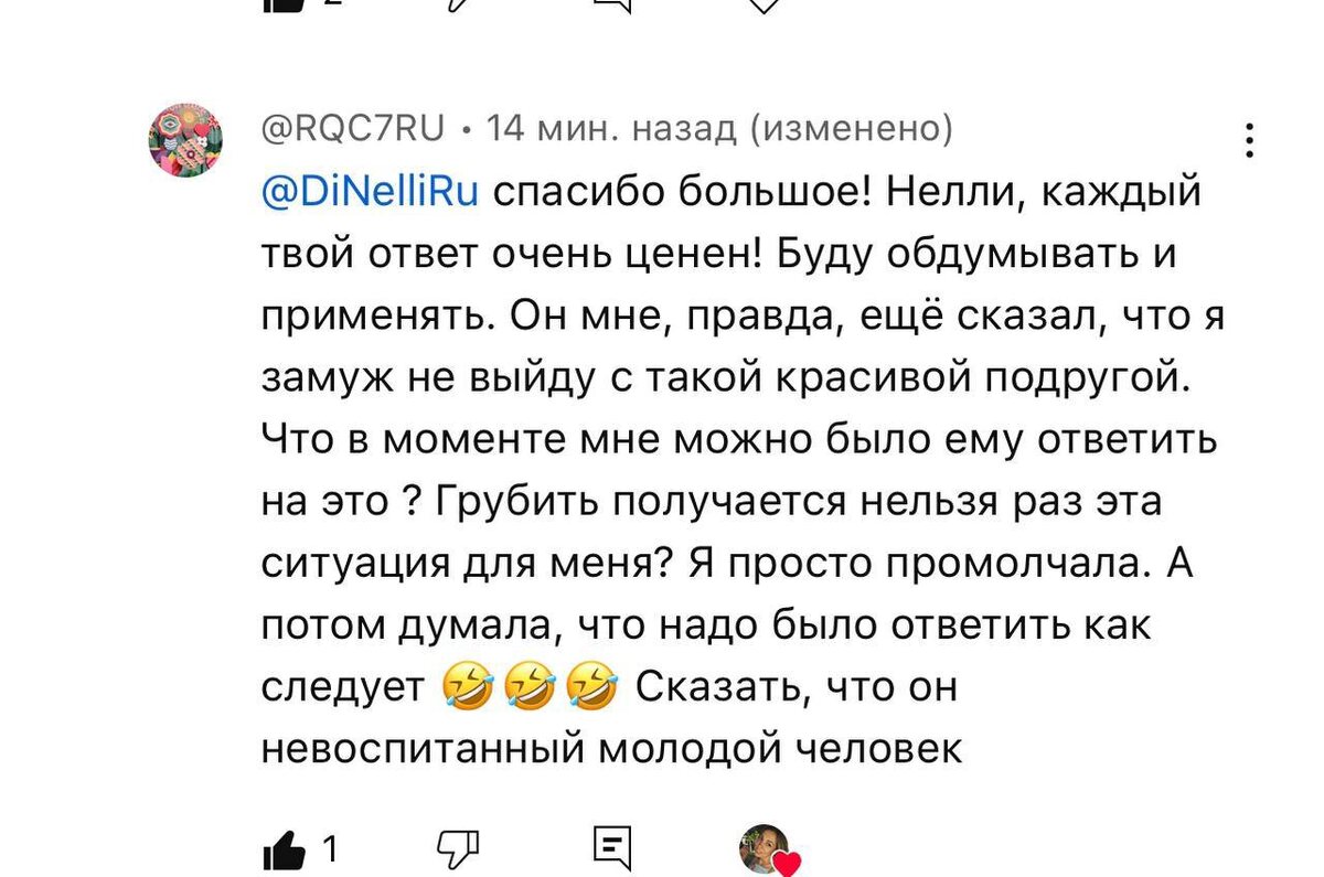Вопрос от подписчика (вторая часть): Спасибо большое! Нелли, каждый твой ответ очень ценен! Буду обдумывать и применять. Он мне, правда, ещё сказал, что я замуж не выйду с такой красивой подругой. Что в моменте мне можно было ответить на это? Грубить получается нельзя, раз эта ситуация для меня? Я просто промолчала. А потом думала, что надо было ответить как следует 😂😂😂. Сказать, что он невоспитанный молодой человек. Ответ: Не важно, как вы проявитесь снаружи, скажете вы что-то хорошее ему или плохое – это не имеет значения. Важно, какой урок вы извлечете, и чем сильнее вам больно внешне, тем больше нужно обратить на это внимание. Если бы он так не уколол, вы бы этот подарок судьбы, ресурс, инструмент не заметили и прошли мимо. Просто почувствуйте благодарность к этому человеку, который смело взял на себя удар, чтобы исполнить эту роль и привести вас в чувства, дать этот ресурс. Ваши души уже давно договорились об этих уроках. Может быть, он и не хотел на себя гнев, но чтобы вам пом