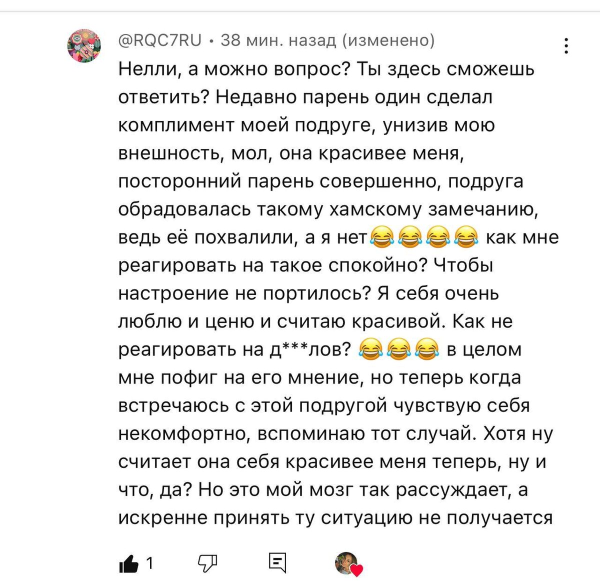 Вопрос от подписчика (первая часть): Нелли, а можно вопрос? Ты здесь сможешь ответить? Недавно один парень сделал комплимент моей подруге, унизив мою внешность, мол, она красивее меня. Посторонний парень совершенно, подруга обрадовалась такому хамскому замечанию, ведь ее похвалили, а я нет 😂😂😂. Как мне реагировать на такое спокойно, чтобы настроение не портилось? Я себя очень люблю и ценю, считаю красивой. Как не реагировать на д***лов? В целом мне пофиг на его мнение, но теперь, когда встречаюсь с этой подругой, чувствую себя некомфортно, вспоминаю тот случай. Хотя ну считает она себя красивее меня теперь, ну и что, да? Но это мой мозг так рассуждает, а искренне принять ту ситуацию не получается. Ответ: В жизни полно желаний, и чтобы их осуществить, мы создаем массу ситуаций, чтобы вытащить оттуда ресурс, знаки и использовать их. В данном случае это просто учителя на вашей дороге жизни, пришедшие показать вам, что вам не хватает для исполнения своих желаний. Чувства, которые заключ