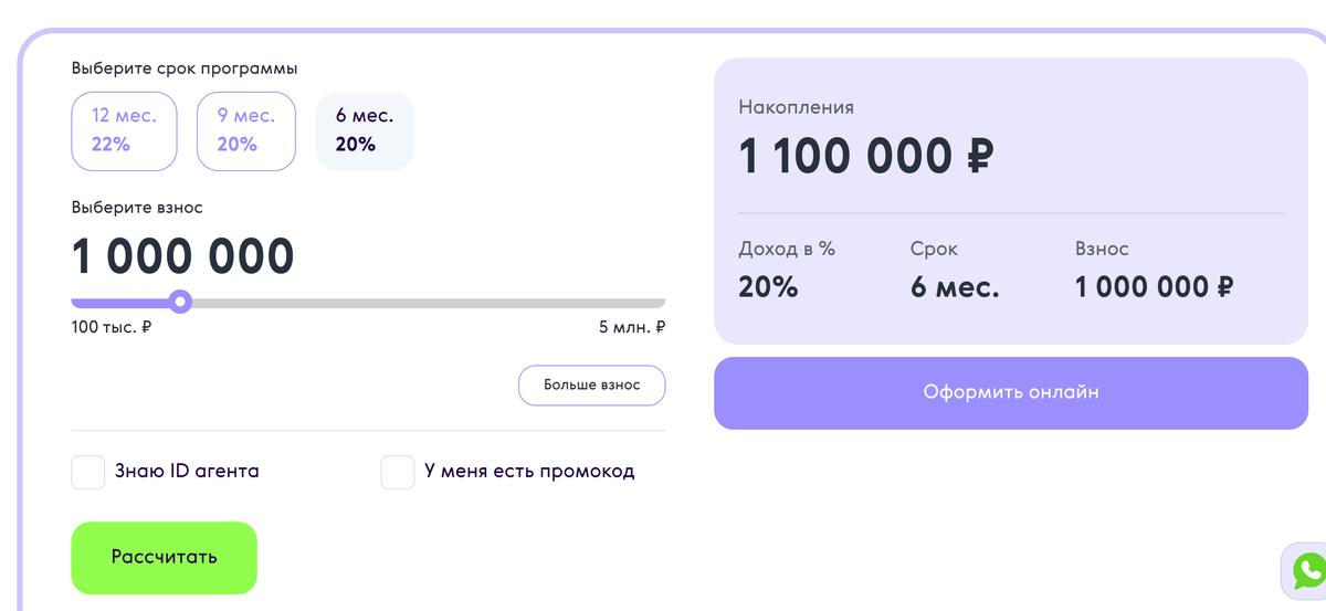 На ноябрь 2024 года ставка составляет 20% годовых. - Указываем желаемую сумму для вложения и оформляем заявку онлайн.
