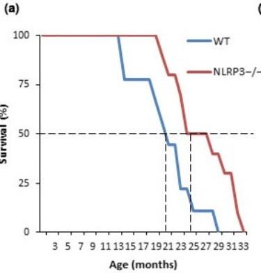 - У мышей NLRP3 — / — (с отключенным геном NLRP3) по сравнению с контрольной группой животных была увеличена средняя продолжительности жизни на 34% и максимальная продолжительности жизни на 29%.