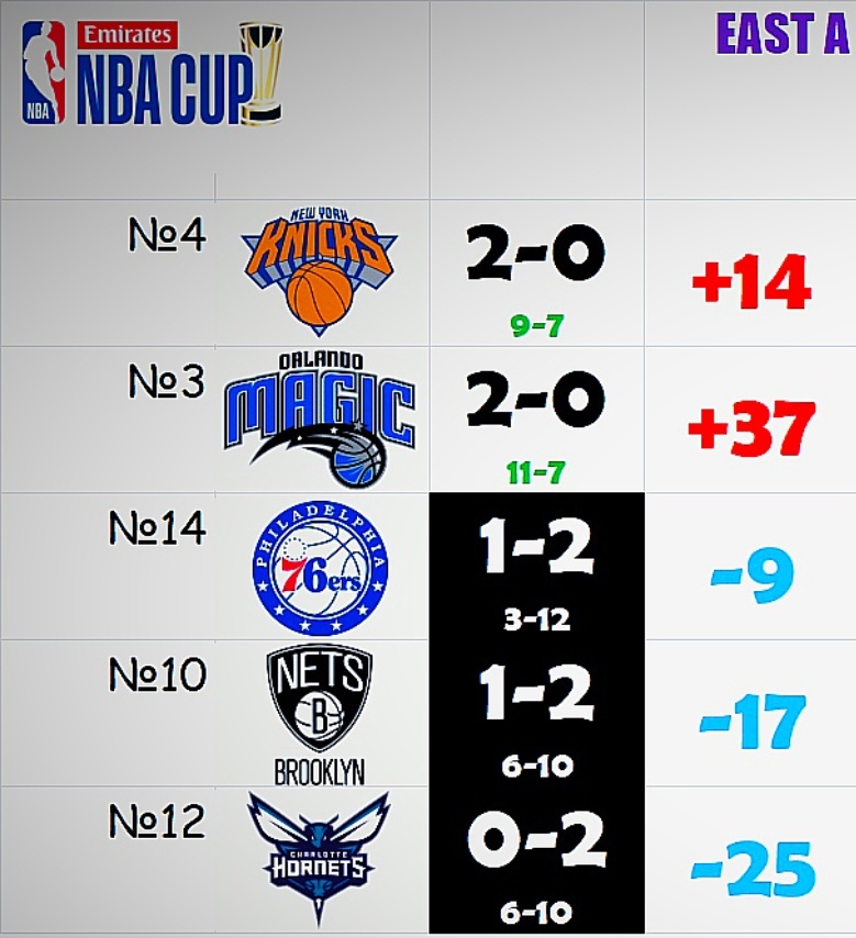 На востоке в группе «А» уже три отщепенца почти стопроцентно отмазались от участия в «декабрьских нокаутах». Можно конечно предположить, что отсутствие давления их расслабит и поможет устроить Нью-Йорку и Орландо. Но до сих пор никто не выходил в следующий раунд с результатом 2-2. Даже 3-1 не всегда гарантирует первое место. Тем более – с учетом последней игры в группе, которую в декабре проведут лидеры между собой – кто-то из них обязательно получит в свой актив третью победу и 3-1 в резюме. Значит результат (2-2) не дает ни одного шанса никому из троицы (Шарлотт, Бруклин и 76-ы) на 1/4 финала кубка.