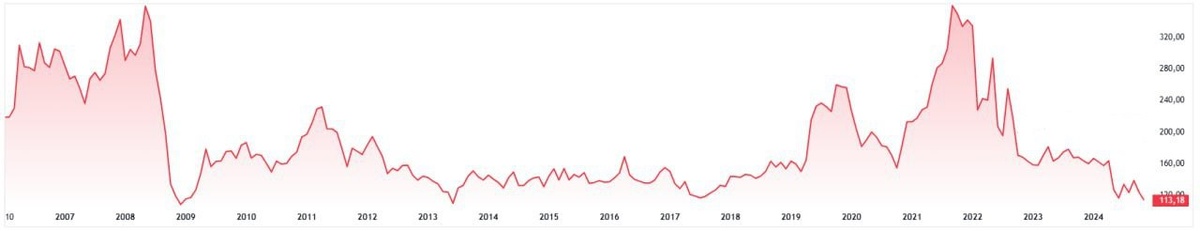 Акции Газпрома упали до исторического минимума. 2008 г, 1 Акция Газпром = 7.45$; 2024 г = 1$