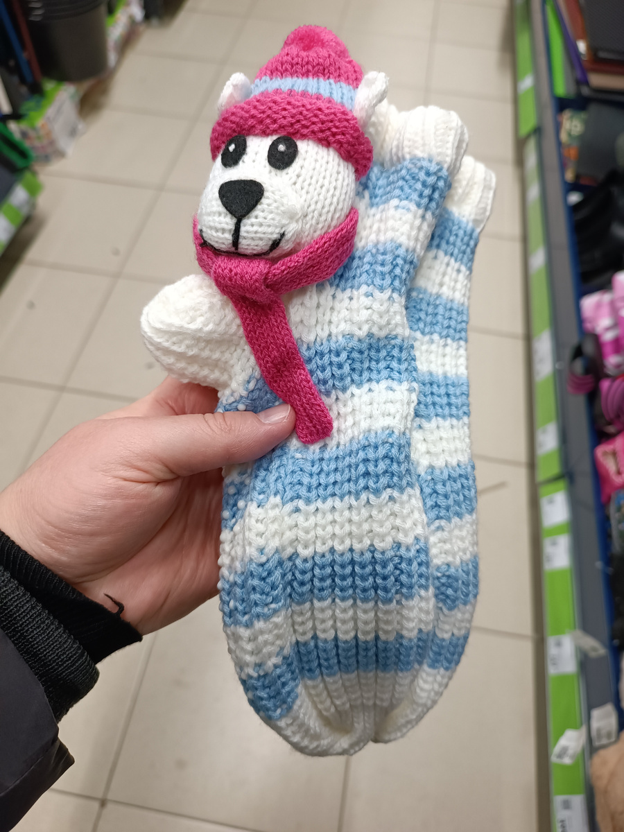 Приветствую! Успеваю снимать с каждой выкладкой. Успеваю показать вам все оперативно. Сегодня же начну обзор с носочков, теплых, зимних... Это домашние носочки, похожие на мягкие игрушки. В них не наденешь обувь, просто по полу ходить без тапочек в носках всегда лучше. Первая - что за игрушка вшита в носок - не поняла. То ли собачка, то ли щенок... Но милое создание в любом случае. На стороне стопы имеются пупырышки силиконовые от скольжения. Вторая игрушка - кажется, сова. А носочки разных цветов Третья - снеговик! и четвертая - лось или я что-то не поняла? И моток с шарфиком тоже не пойму, к чему это? Больше всех понравилась первая игрушка. Пряжи полно, но новинок нет. Есть только пополнение старых, которые месяц или два назад уже привозили. Слева вторые с ценником, их подвезли. Этикетку, как всегда, показываю. состав: уходовые значки Есть белый два оттенка серого. В этой коллекции белый - немного молочный. А темно-серй - немного с коричневым оттенком. Еще черные толстые нитки п