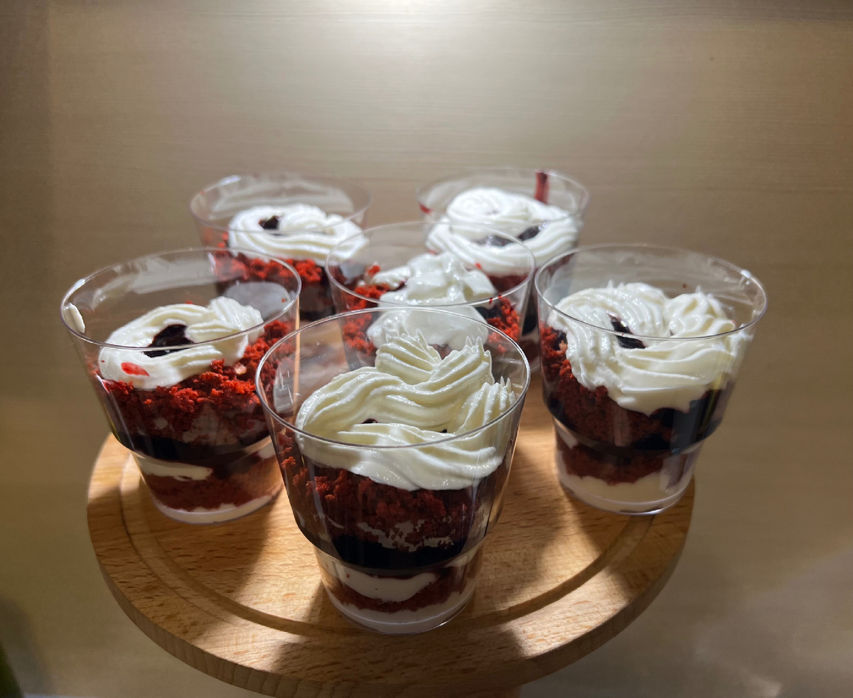 Порционная подача тора Красный бархат. Для трайфлов сделаем ягодную прослойку из черной смородины, будет приятный аром и запах. Вот такая красота получается: Ингредиенты (бисквит): Ингредиенты (крем): *чтобы хватило крема нужно взять 2 банки рикотты и 1 банку мягкого творога 170 гр. Ингредиенты (ягодная прослойка): Приготовление (бисквит): Для бисквита отделяем белки от желтков. К желткам добавляем: сахарозаменитель, разрыхлитель и какао. К белкам щепотку соли. В кефир комнатной температуры добавляем краситель и тщательно смешиваем. Соединяем смесь красителя и кефира с желтками и тщательно смешаем, затем добавляем муку. Белки взбиваем до белых и устойчивых пик. Смешиваем две смеси при помощи силиконовой лопатки. Выкладываем тесто в форму и убираем в разогретую духовку до 170 градусов на 20 минут. По готовности форму достаем, выкладываем бисквит и даем остыть. Вот такой плотный, бордовый цвет получился (бисквит очень мягкий). Далее перебиваем бисквит в крошку с помощью блендера. Переби