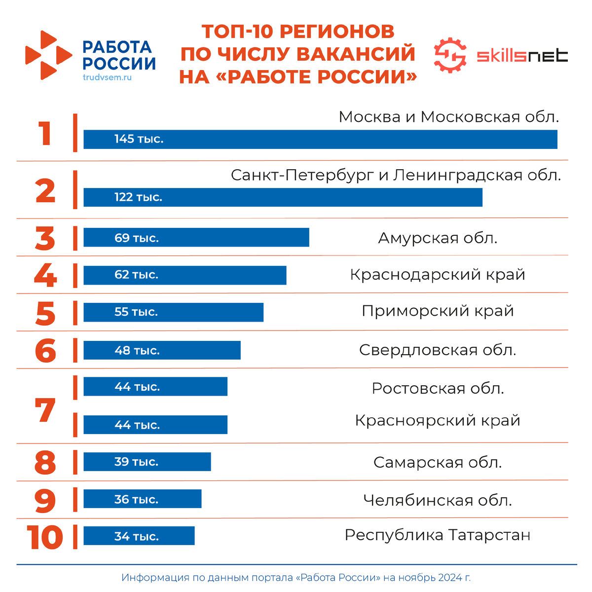 Роструд составил топ-10 регионов по данным портала «Работа России», где на сегодняшний день доступно больше всего вакансий. Возглавил тройку лидеров столичный регион, Москва и Московская область, более чем с 145 тыс. предложений для трудоустройства. Далее идут Санкт-Петербург и Ленинградская область – работодатели в сумме разместили порядка 122 тыс. открытых позиций. Амурская область на третьем месте – 69 тыс. вакансий. Продолжает рейтинг Краснодарский край – четвертое место и 62 тыс. объявлений с возможностью для трудоустройства. Замыкает топ-5 Приморский край - 55 тыс. вакансий. На шестом месте Свердловская область – 48 тыс. предложений. Ростовская область и Красноярский край – седьмое место и порядка 44 тыс. объявлений в каждом регионе. На восьмом место Самарская область – 39 тыс. открытых рабочих мест. Челябинская область – девятое место и более 36 тыс. вакансий. Замыкают топ-10 Республика Татарстан - работодатели разместили порядка 34 тыс. объявлений. Наиболее востребованные сект