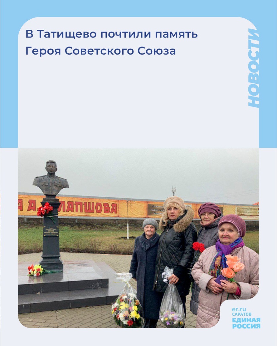 🎖️100 лет со дня Рождения Героя Советского Союза Анатолия Алексеевича Лапшова отметили в Татищево митингом и возложением цветов к монументу. Совместно с ветеранами, представителями старшего поколения приняли участие в митинге, посвящённым 100-летию со дня рождения Героя Советского Союза 👥В мероприятии приняли участие жители поселка, учащиеся школ, представители старшего поколения и активисты партии «Единая Россия» Региональный координатор проекта «Старшее поколения» партии «Единая Россия» в Саратовской области, депутат городской Думы Ирина Видина поделилась своими впечатлениями. 💬«Анатолий Алексеевич в 18 лет был призван в армию. Сражался на разных фронтах, участвовал в освобождении многих городов и битве за Берлин. Звание Героя Советского Союза Анатолию Алексеевичу присвоили посмертно за отвагу и доблесть в боях. В память о Лапшове названы улицы в Татищево и селе Идолге, а с 2020 года школа в Идолге носит его имя. В сквере, названном именем Героя, с сестрой Лапшова - Архипов