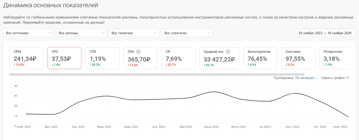 - мониторить динамику рекламных кампаний. «Пульс» позволяет анализировать изменения CR, CPM, CTR и других важных показателей на протяжении длительных периодов. Также здесь можно отслеживать ежемесячные тенденции – это поможет точнее спрогнозировать поведение рекламы в будущем;