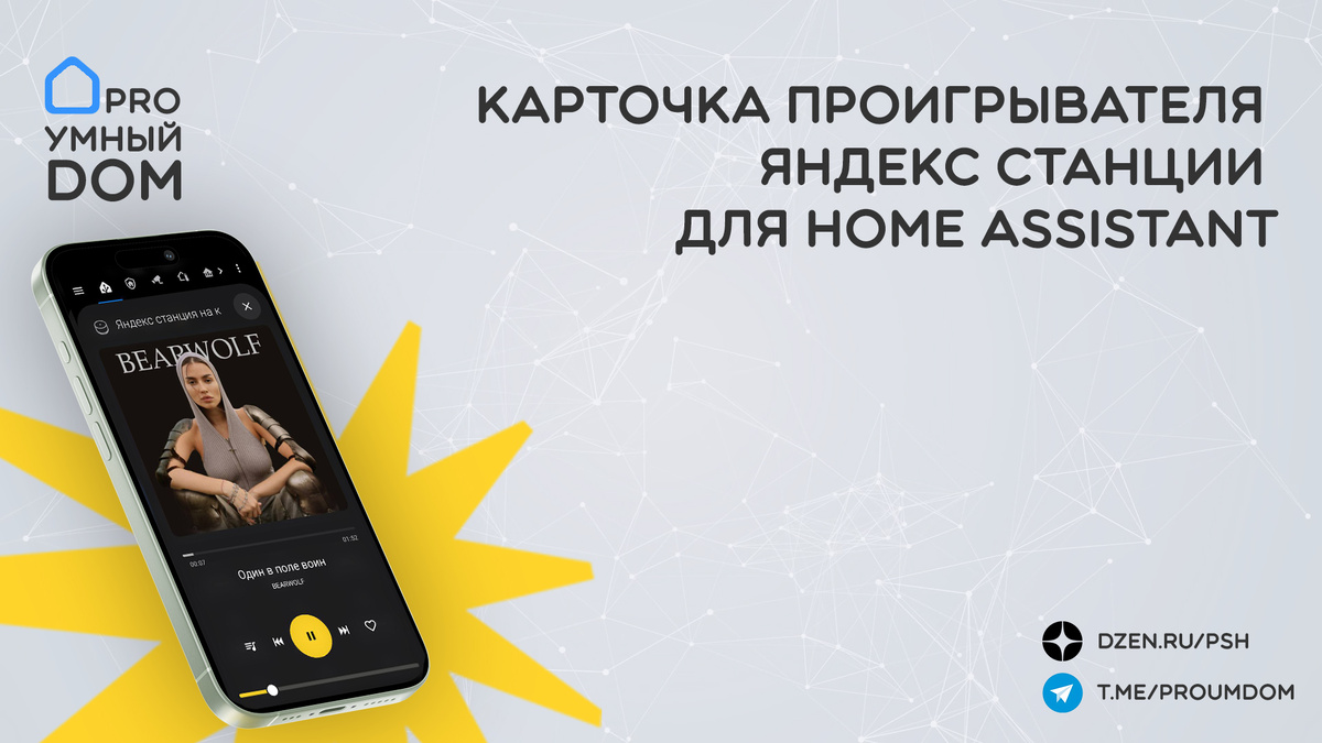 Для создания карточки управления медиапроигрывателем Яндекс.Станции в Home Assistant необходимо установить несколько компонентов через HACS (Home Assistant Community Store). Включите в свой HA следующие пакеты: Яндекс.Станция для Home Assistant - Компонент для управления Яндекс.Станцией и другими устройствами с Алисой из Home Assistant. Позволяет интегрировать Яндекс.Станцию в систему умного дома для управления голосом и через интерфейс HA. Yandex Icons - Набор иконок для устройств Яндекс, специально созданных для использования в Home Assistant. Подходит для отображения различных устройств от Яндекса в интерфейсе HA. Mushroom - Набор карт и модулей для, предлагающий красивые и функциональные элементы управления и отображения данных в интерфейсе. Slider card - Карточка для управления слайдерами в Home Assistant. Применяется для настройки различных значений, например, яркости или температуры и т.п.. Card mod 3 - Плагин для модификации карточек в Home Assistant. Позволяет изменять стили и