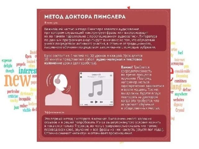 Метод Пимслера основан на принципах когнитивной психологии и нейролингвистики:
