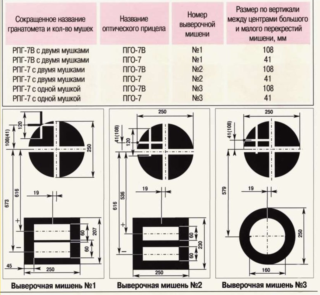 Проверка прицельных приспособлений гранатомета производится с помощью предназначенных для этой цели мишеней и правил, указанных в табл. 2, с целью согласования направления оси трубы с оптической осью прицела и линией прицеливания основной мушки.