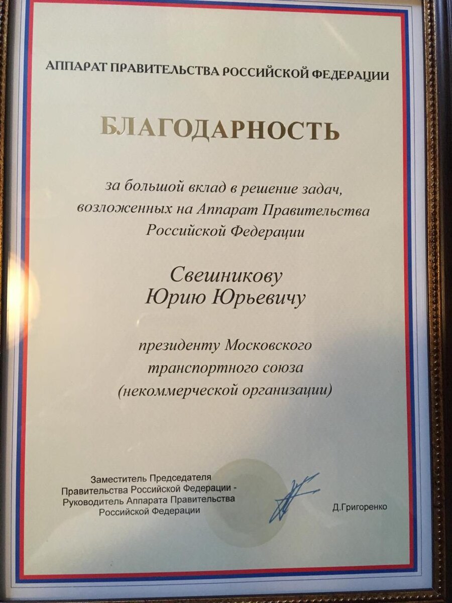 Член Общественного совета при Ространснадзоре Свешников Юрий Юрьевич был удостоен благодарности Аппарата Правительства Российской Федерации