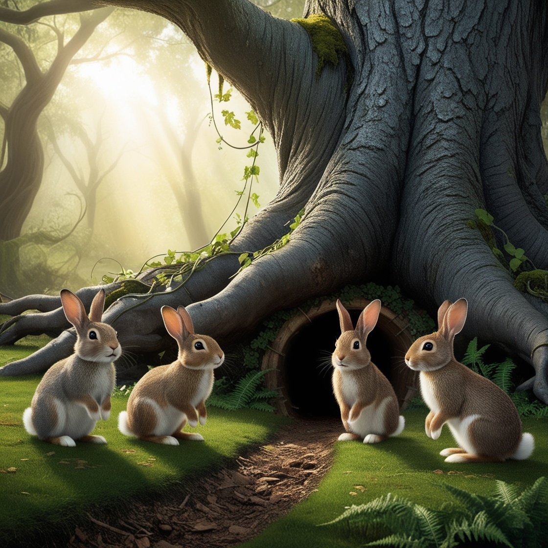 В Волшебном лесу всё, казалось, было привычно и спокойно. У кроликов Кувырка, Снежинки, Прыгунчика и Пушинки дел хватало: морковка в огороде подрастала, цветы в саду радовали глаз, а солнечные дни манили на луг, где шептались феи. Но именно в такие безмятежные дни часто происходят неожиданные открытия. — У корней Старого дуба снова появились странные трещины, — сказал Прыгунчик, возвращаясь с прогулки. — Ты уверен? — насторожилась Снежинка. — Мы ведь только недавно закопали те старые дыры. — Да, но сейчас это больше похоже на тоннель, — отозвался Прыгунчик, его глаза горели любопытством. Кувырок поставил лейку и задумчиво посмотрел на друзей. — Думаю, стоит посмотреть. Если там что-то необычное, лучше узнать об этом сейчас, чем ждать, пока из тоннеля вылезет кто-нибудь… неожиданный. Корни Старого дуба переплетались, словно огромная паутина. Когда кролики подошли ближе, они увидели, что действительно одна из трещин раскрылась больше обычного. Тёмный зев тоннеля уходил глубоко вниз. — Эт