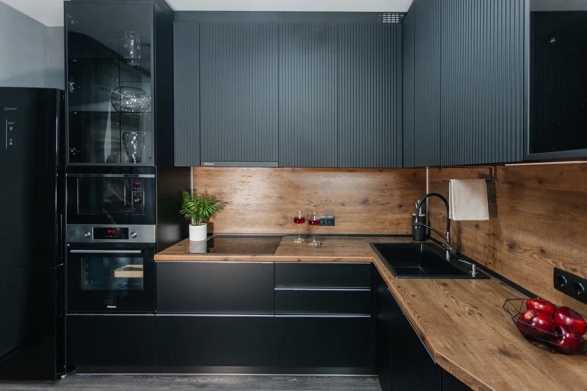 Чтобы не переборщить с рифлением, оформляйте им только одну часть гарнитура: верх или низ. Конечно, всю кухню сделать стеклянной вряд ли кто-то захочет. Но вот добавить акцентный модуль - очень хорошая идея. В таком шкафу можно хранить красивую посуду или расставить интерьерный декор. Внутри обычно устанавливается подсветка, которая поможет создать необходимую атмосферу. Яркие кухни были в моде, однотонные тоже, пришло время комбинировать. Чаще всего в двухцветных гарнитурах тёмные или более выделяющиеся оттенки отдаются нижним ярусам, а для верхних выбирают светлые варианты или даже в тон потолку. Так кухня кажется