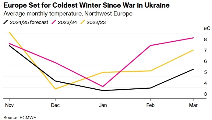 Холодная погода может привести к повышению и без того высоких расходов на электроэнергию. Температура в марте будет ниже, чем в последние два года Европу ждёт самая холодная зима с момента начала боевых действий на Украине, что приведёт к дальнейшему росту цен на энергоносители. Континент расходует запасы газа быстрее, чем обычно. Согласно прогнозам Европейского центра среднесрочных прогнозов погоды, собранным Bloomberg, температура с настоящего момента по март будет ниже, чем в последние два года. Это может привести к тому, что спрос на отопление достигнет рекордного уровня с начала конфликта в Украине, как сообщает Maxar Technologies Inc. Однако континент остаётся уязвимым к погодным изменениям. Холодная зима усилит давление на и без того высокие цены на газ и электроэнергию. Это может совпасть с прекращением поставок газа через Украину с 1 января, когда температура обычно достигает минимальных значений. Европу ожидает самая холодная зима со времен начала конфликта на Украине. Средне