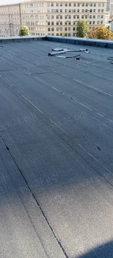 Кровельщики ООО "РСК-24" отремонтировали плоскую кровлю площадью 1500 м2. Итог кровельных работ с битумной гидроизоляцией на фото:
