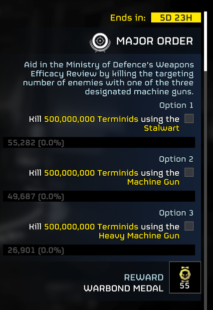 В Helldivers 2 стартовала новая главная миссия, которая предлагает хеллдайверам протестировать три пулемета: M-105 Stalwart, MG-43 Machine Gun и MG-206 Heavy Machine Gun. Задача проста: уничтожить как можно больше врагов, а первый пулемет, который достигнет заданного числа убийств, будет признан оптимальным для борьбы с жуками. Тем временем разработчики продолжают перенастройку Демократической Космической Станции, которая не всегда отличает союзников от врагов. Хотя недавно построенная станция показала себя как мощное орудие, она также случайно уничтожает своих же бойцов, что стало проблемой для команды Arrowhead. Однако, Министерство Обороны в описании миссии заявило, что "Станция остается ценным инструментом в борьбе за Свободу", и дайверы могут рассчитывать на ее поддержку, несмотря на временные недостатки. Тестирование пулеметов стало частью программы по совершенствованию стандартного вооружения. Благодаря проведению боевых испытаний в реальных условиях, игрокам предстоит выбрать н