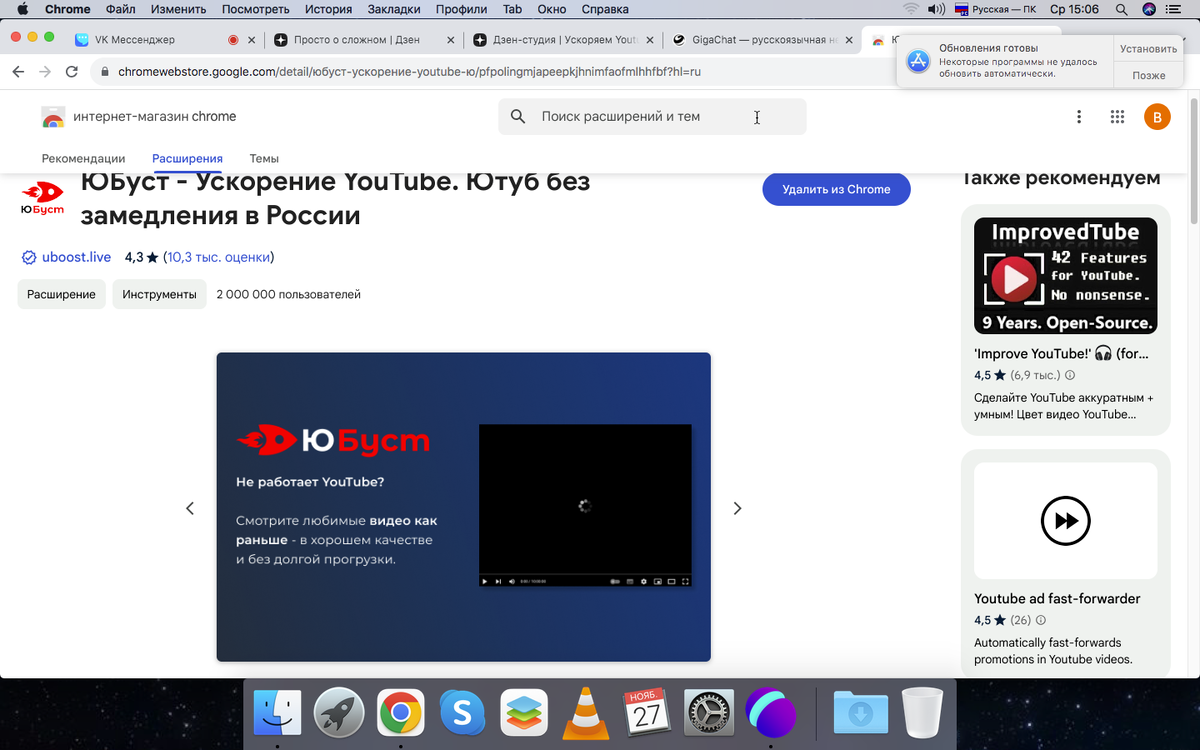 Все знают, что Ютуб сейчас в России работает не очень хорошо. Многие любят смотреть видео там, но теперь это стало сложнее. Даже в Рутубе не всё найдёшь. Поэтому люди начали использовать VPN или разные расширения, чтобы всё-таки смотреть видео. Я учусь в школе, и нам иногда показывают классные видео на уроках. Но когда Ютуб стал медленным, учителя тоже столкнулись с проблемами. Им пришлось искать другие способы показывать видео. Моя учительница использовала сайт 9Convert (https://9convert.com/en429), чтобы скачать нужные видео и загрузить их на Гугл Диск. Потом она включала эти видео с диска. Но диски быстро заполнялись, и ей нужно было придумать другой способ. Она нашла крутое расширение ЮБуст, которое помогло сделать Ютуб быстрее. чтоб его использовать Если у тебя на компьютере не работает Ютуб, попробуй установить бесплатное расширение ЮБуст. Это совсем просто и быстро! Сначала напиши в поисковике слово «ЮБуст» по-русски. Открой первую ссылку – там будет написано «ЮБуст - ускорит