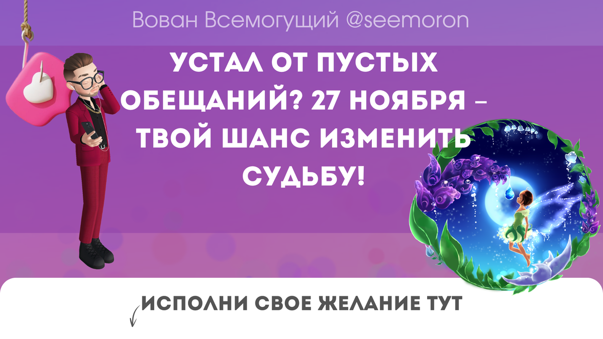 Привет. Знаю, ты устал ждать чуда. Мечты кажутся недостижимыми, а желания растворяются в серой бытовухе. Но что, если я скажу тебе, что 27 ноября – это твой шанс переломить ситуацию и взять жизнь в свои руки? В этот день Небесная Канцелярия открывает прием желаний! Каждое твоё слово будет услышано, каждая мечта – замечена. Я, Вован Всемогущий, готов поделиться с тобой секретной техникой, которая поможет активировать волшебную силу Вселенной и исполнить твои заветные желания. 1. Остановись и прислушайся к себе. Чего ты действительно хочешь? Представь свою мечту во всех деталях, прочувствуй радость её исполнения. 2. Обратись к Вселенной с искренней просьбой. Сложи руки перед грудью и попроси о помощи в реализации твоего заветного желания. 3. Движение – это жизнь! Сделай 27 осознанных шагов, считая их про себя или вслух. Каждый шаг – это приближение к твоей мечте. 4. Произнес