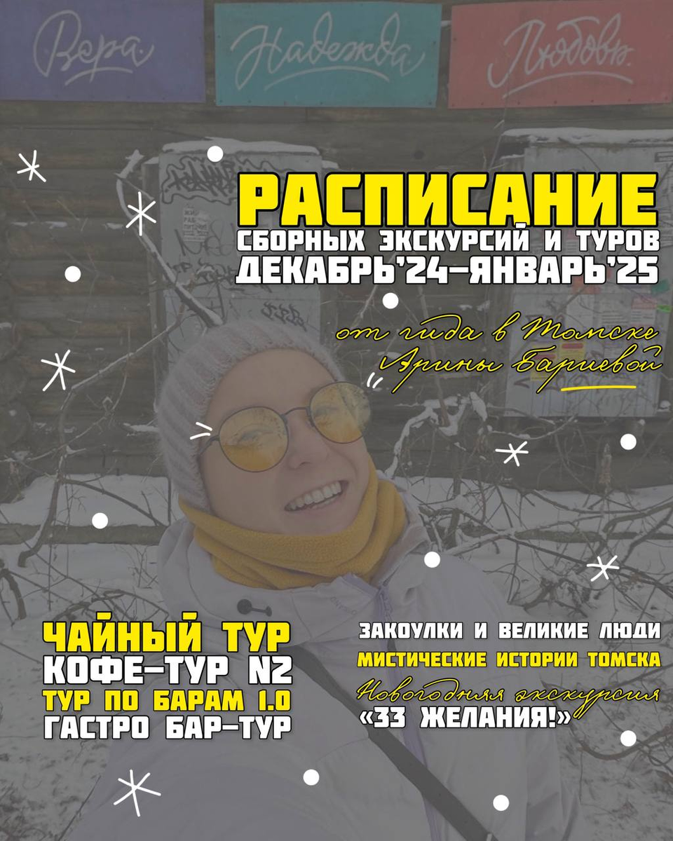 Каждая экскурсия и тур могут быть проведены в индивидуальном формате и есть подарочные сертификаты на сумму/тур. *** 🍷14.12 СБ 17:30 ГАСТРОНОМИЧЕСКИЙ ТУР ПО БАРАМ Три бара, закуски, изучаем фуд-пэйринг, играем 2600 р/чел (вкл. закуски, напитки, такси) 2,5 ч, есть 2 места из 12 *** ☕️21.12 СБ 11:15 КОФЕЙНЫЙ ТУР N 2 Гадание на кофейной гуще в турецкой кофейни и мастер-класс по альтернативным методам заваривания (харио, аэропресс) 1890 р (вкл. мастер-класс, дегустация, гадание) 2.5 ч, есть 4 места из 6 *** 🥂 4.01.25 СБ 18:00 ТУР ПО БАРАМ 1.0 4 бара разного формата, новые знакомства, игры, велком-дринки 2300 р/чел (вкл. напитки, такси) 3 ч, есть 10 мест из 12 *** ‼️ДОПОЛНИТЕЛЬНАЯ ДАТА‼️ 🎄4.01.25 СБ 14:00 Новогодняя экскурсия «33 ЖЕЛАНИЯ!» Проедем по всем самым волшебным местам города, где загадаем свои заветные желания. В основе истории необычных памятников, которыми богат Томск. 1800 р/чел, 2900 р/мама+ребенок (вкл. транспорт и усл.гида) 2-2,5 ч, на транспорте с выходами, кол-во м