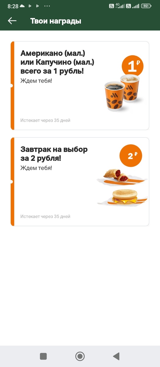 Привет, друзья! Сегодня с утра ДМ повез меня на работу к 8ми и я вспомнила, что мы можем почти бесплатно попить кофе во "Вкусно и точка", это прямо возле моей работы. Откуда такая цена? Сейчас в Т2 идет акция, можно лишние минуты менять на разные "плюшки" , в том числе и на еду из этого самого бистро". Вот я и меняю лишние минуты на завтрак. 😁 Можно лишние минуты обменять или Гб. Что я и сделала. Мелочь, но приятно. Если бы я, находилась далеко от "Вкусно и точка", то вряд ли поехала бы за бесплатным пирожком, а тут прямо около работы😁😁😊 На работу привезла пирожок и кофе, а ДМ остался пить кофе в машине, потом поехал по делам. На работе я устроила себе второй завтрак через часик после начала рабочего дня, это так мило 😁😁😁 У меня есть еще есть возможность перекусить за несколько рублей во всем известном кафе😁😁😁 Посмотрю, пока особого желания не возникает. Ещë я лишние минуты на 5 литров бензина обменяла, слегка подзаправились 😁😁😁 А вы пользуетесь подобной х