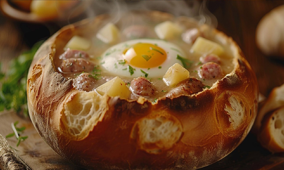 Этот суп на мучной закваске известен в Польше и Беларуси уже много веков. В Польше, кстати, существует забавная легенда о том, как изобрели журек. Жил-был в одном городке жадный корчмарь, который обсчитывал своих клиентов и вообще вел себя как порядочная свинья. Однако готовил хорошо и конкурентов особых не имел. Жители городка все равно были недовольны и наняли человека, который сделал жадному корчмарю интересное предложение. Корчмарь должен был приготовить самый дешевый и невкусный суп, а гость должен был это съесть. Если гость не отравится — корчмарь должен отдать рецепт вместе с заведением, а если отравится — корчмарь получит мешок денег (и, видимо, лопату, чтобы труп клиента закопать). Неизвестно, что думал корчмарь насчет трупа, но денег хотелось, вот он и намешал в котле бурду из остатков закваски, лука, мясных обрезков и чеснока. Видимо, он был очень талантливым поваром, потому что, даже постаравшись, не смог приготовить отраву. Так мир получил рецепт журека, а корчмарь лишил